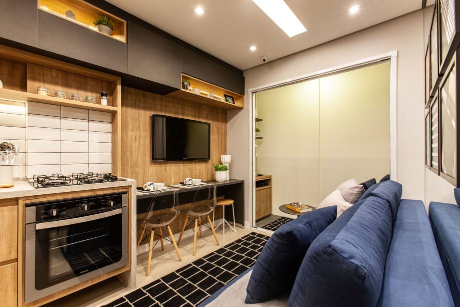 A área de convivência, que funciona como sala de estar/jantar e cozinha, foi toda integrada. No espaço da TV, o sofá azul se destaca, ao lado da bancada móvel, que pode se movimentar pelo ambiente e fazer as vezes de mesa de jantar.