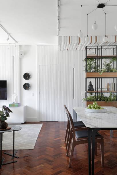 No décor, predomina-se o branco das paredes da sala, que veio em diferentes texturas: atrás da mesa de jantar, no revestimento de tijolinhos já existente antes da reforma; no corredor, no painel ripado que esconde a porta de entrada e o acesso à cozinha.
