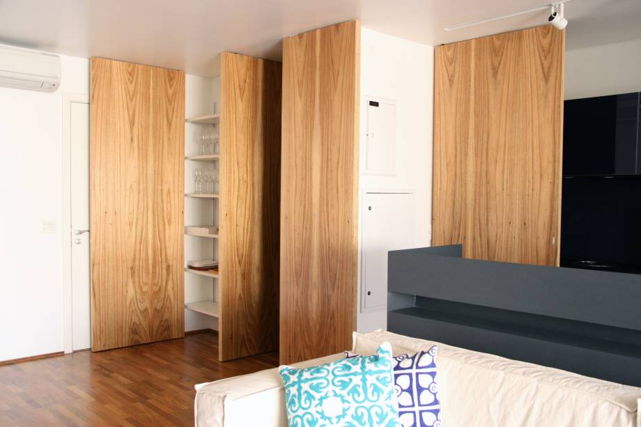 O imóvel, que se localiza no bairro do Brooklin (São Paulo), mede 80 m². Com as mudanças sugeridas pelos profissionais, as áreas sociais foram integradas a partir da demolição de paredes e as esquadrias – que fragmentavam o espaço – foram removidas.
