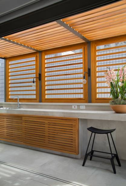 “Também nivelamos o piso do terraço, criamos uma calha oculta e uma esquadria especial, em dois níveis (do piso e do deck). Quando as portas estão totalmente recolhidas, confere a sensação de um espaço único”.