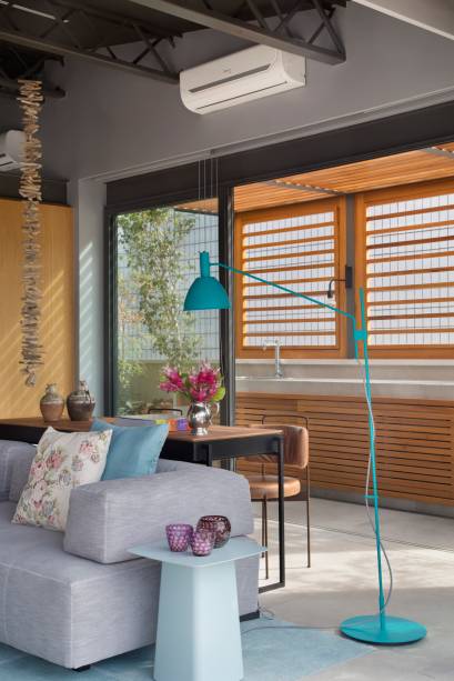 “O deck com passarela e o banco de cimento, que entra no living até compor o rack, criam uma unidade visual entre os ambientes internos e externos”, conta Adriana.