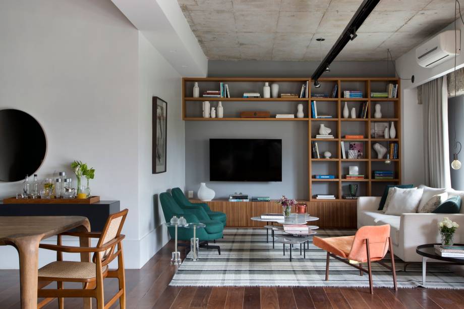 Para conferir um ar mais despojado à decoração, Adriana apostou em estofados e acessórios nos tons verde e laranja. Ela recebeu, ainda, obras de arte e móveis de design brasileiro assinados por nomes como Jorge Zalszupin e Jader Almeida.