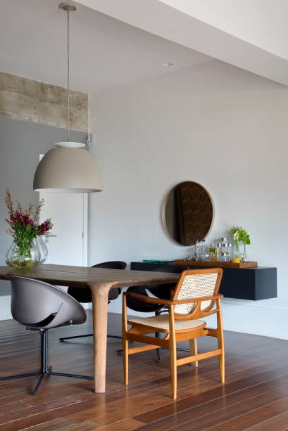 Na área social, o assoalho foi aproveitado e a arquiteta tirou partido da viga e teto de concreto, ampliando o pé direito.