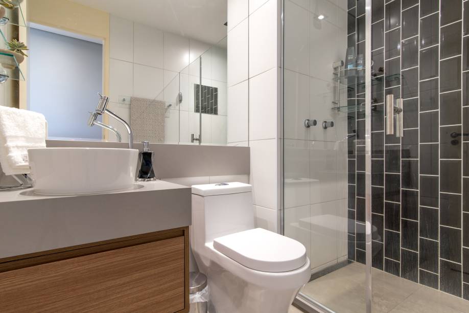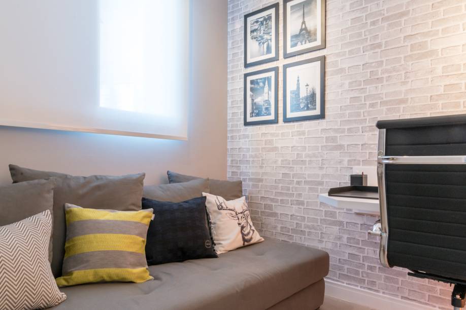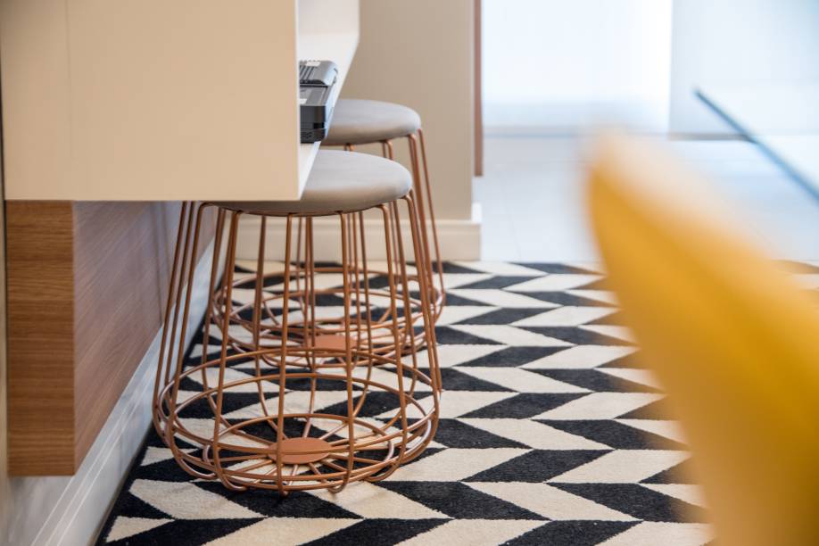 Para contrastar com as cores neutras desta escolha, a paleta do décor é formada por tons de azul marinho, preto, branco e cinza, somada a toques de amarelo.