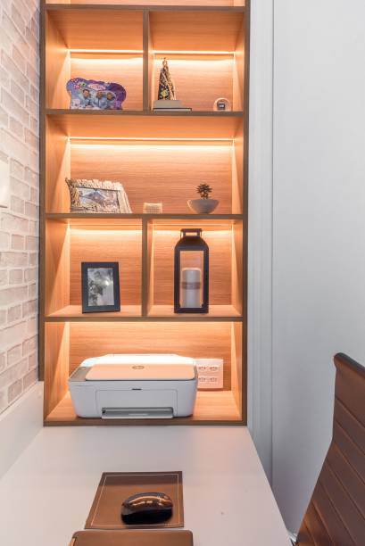 Outro ponto forte do projeto é a iluminação. De acordo com o uso do espaço que o morador deseja naquele momento, é permitida a criação de várias cenas. No escritório de tons terrosos, por exemplo, a luz embutida nas prateleiras traz um charme a mais.