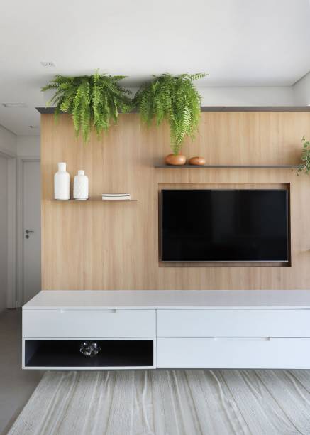 A sala de estar integrada com a varanda deu mais amplitude ao ambiente. Nela, está o grande destaque do projeto: o painel da TV e a estante de livros ao lado, que recebem também itens decorativos e traz a natureza para o interior.