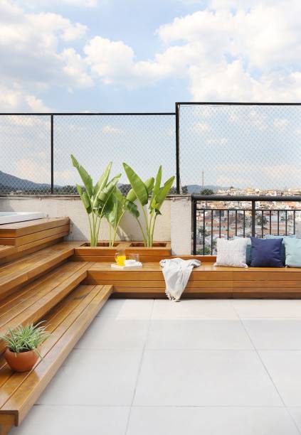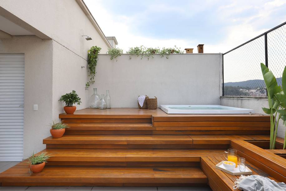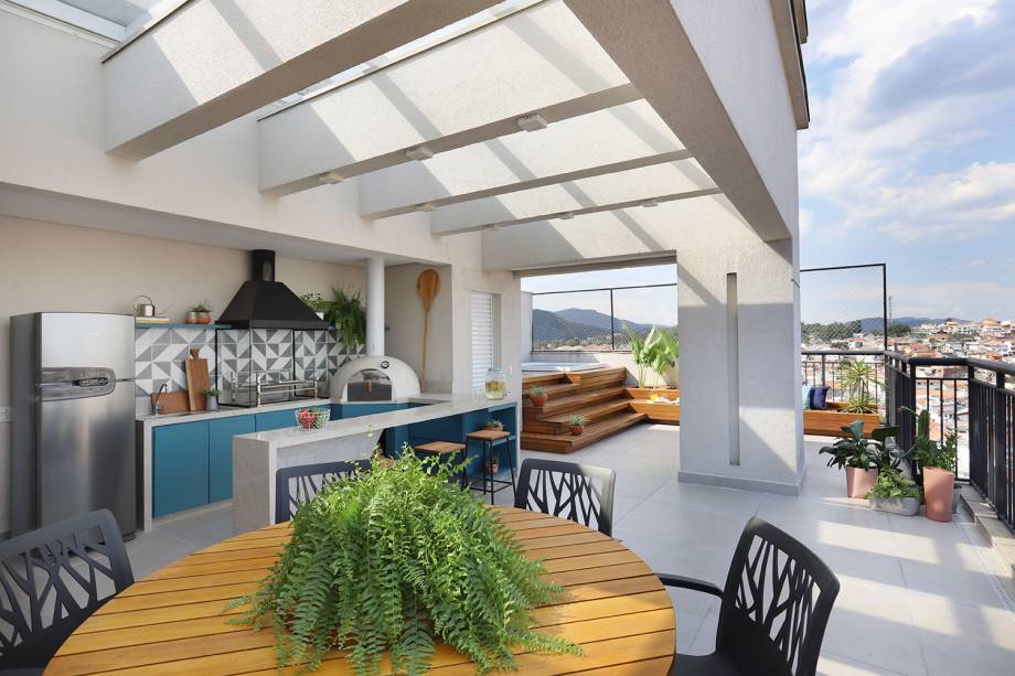 Já na área do terraço, buscou-se criar um ambiente descontraído. Para que se tornasse uma área social interessante, foi projetado um espaço gourmet com churrasqueira, forno de pizza e bancada de apoio de granito branco itaúnas, um novo lavabo e o espaço da Jacuzzi, com deck que vira banco de madeira cumaru.