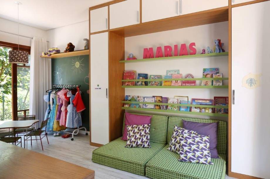As cores também não podiam faltar na brinquedoteca, espaço pensado para as filhas pequenas do casal. Nela, as meninas contam com um ambiente amplo para dar asas à imaginação, estimulada pelas estampas lúdicas e pigmentações divertidas.