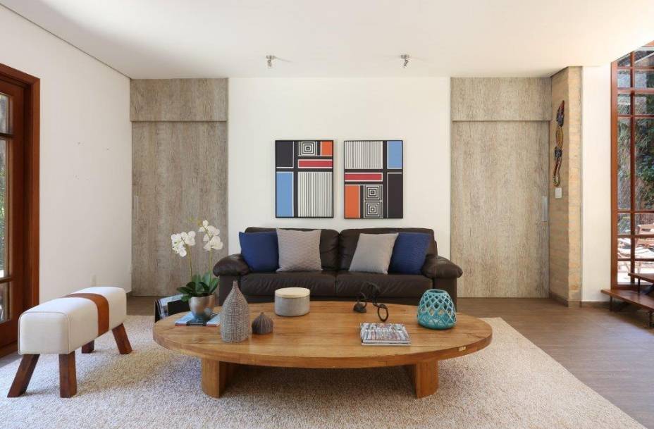 Na sala de TV, as estampas coloridas e descontraídas trouxeram vida ao ambiente. Além disso, por contrastarem com os tons neutros, que se estendem do sofá às paredes, combinam também equilíbrio e aconchego.