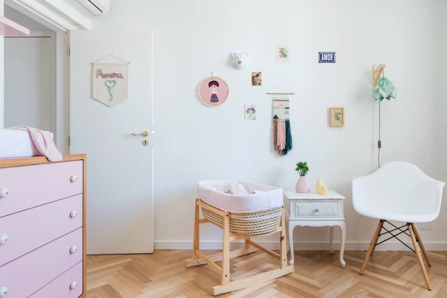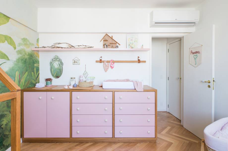 “As cores predominantes no projeto são o cinza, verde e rosado. A madeira está muito presente no piso e nos móveis. Temos também a estrutura de concreto do apartamento que fixou toda a mostra e a escada que também foi feita em concreto”, explicam as arquitetas sobre o décor.