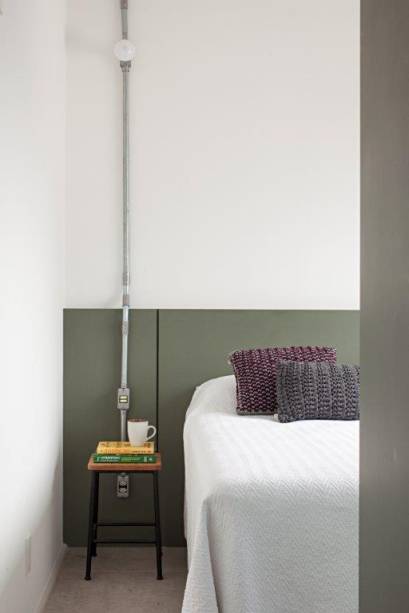 Para a decoração, os residentes desejavam algo mais dinâmico do que somente quadros na parede. “Sugerimos, então, o uso de uma malha pop dessas usadas em obras, para que com ganchinhos eles pudessem criar as composições que desejassem”, contam os arquitetos.