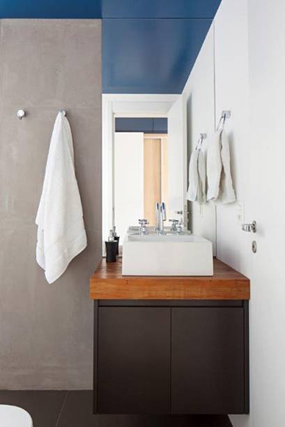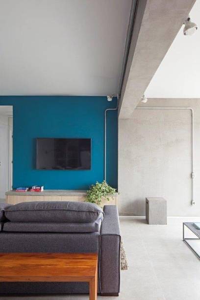 Para realçar a sensação de amplitude requerida pelos irmãos, o mesmo piso de porcelanato foi usado em todo o apartamento, criando homogeneidade. Nas paredes, o concreto aparente alterna-se ao colorido que delimita a área da TV e traz vida aos interiores.