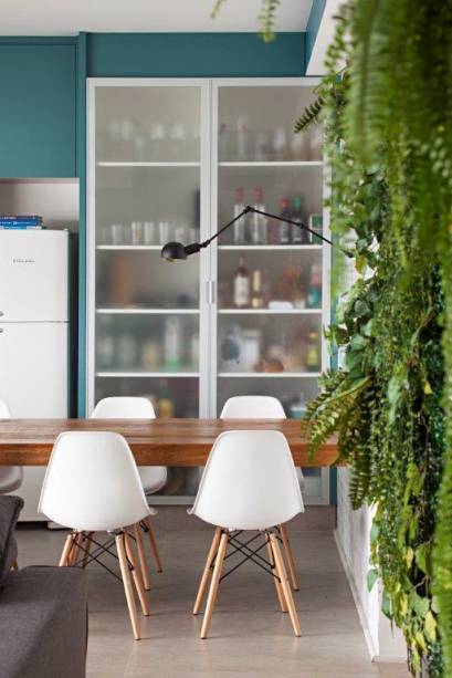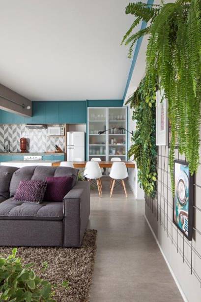A estrutura funciona como um painel em branco, que serve também para abrigar plantas pendentes e compor um jardim vertical, dando ainda mais cor à sala.