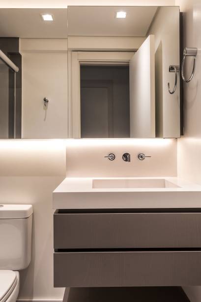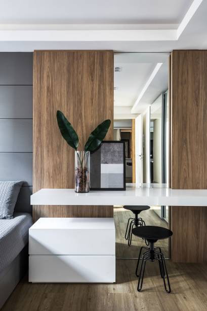 A suíte mantém a mesma linguagem e o conceito do apartamento, com o uso de tonalidades de cinza, branco e preto, além da madeira, que garante o tom aconchegante.