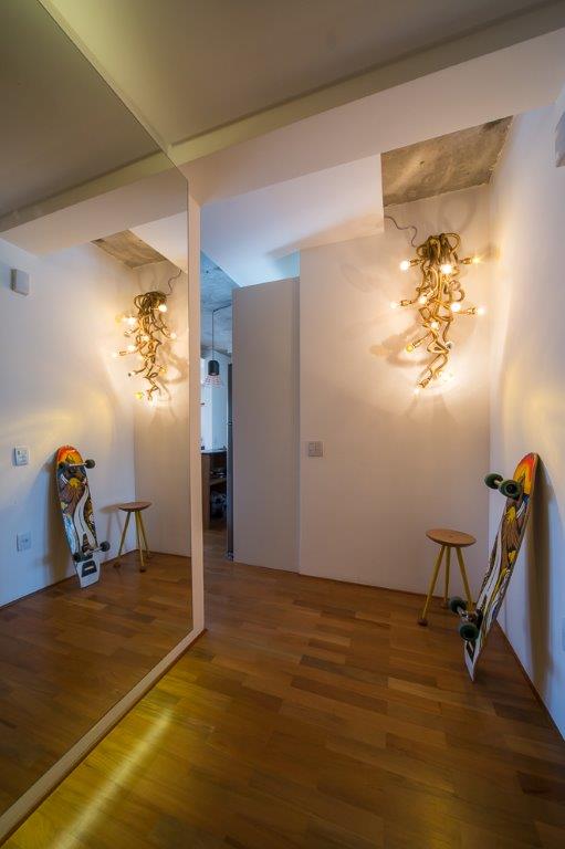 O apartamento Pole Dance, como foi chamado o projeto, recebeu lajes de concreto aparentes na varanda e na sala, que buscam uma referência underground para o apartamento.