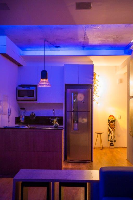 O forro de gesso, planejado para ser solto da laje, recebeu fitas de LED convencionais e outras em RGB que possibilitam uma enorme variação de cores de acordo com as vontades do proprietário.