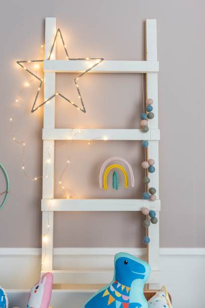 As prateleiras de ferro ao lado do berço foram as responsáveis por criar alturas e exibir enfeites e brinquedos. A ideia mais inusitada do projeto, porém, fica para a escada: o elemento é um apoio para uma estrela de LED, que serve tanto como elemento decorativo quanto como iluminação suave para o bebê dormir.