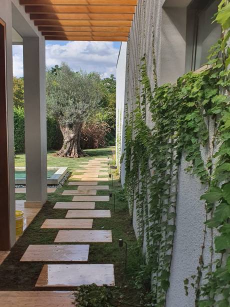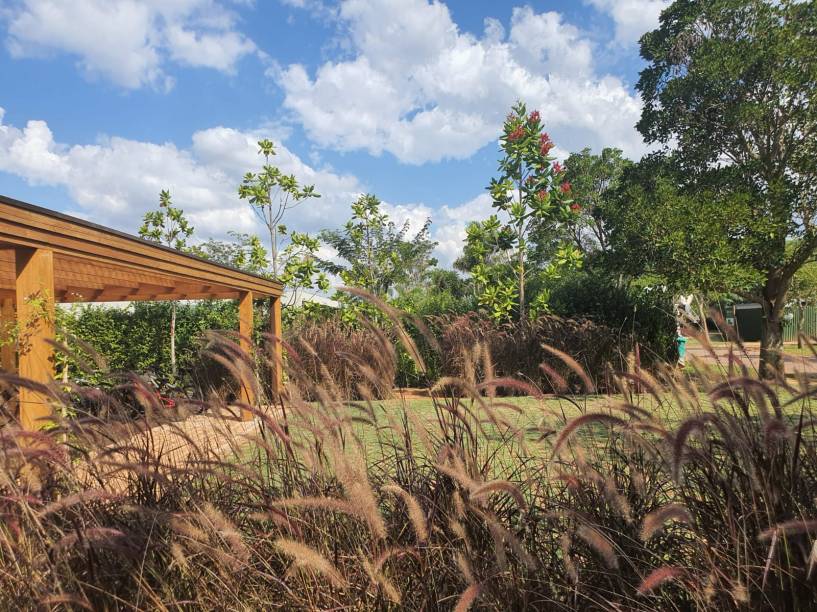 O conceito do projeto prioriza a harmonização sutil entre o estilo campestre com toques tropicais, sem excessos. A cuidadosa escolha de plantas, como jabuticabeiras, oliveiras, ipês brancos e palmeiras rabo de raposa, contribui para a estética visual do espaço. Destaca-se a inclusão de uma oliveira centenária, trazida do sul do país, que se tornou uma peça distinta e significativa no projeto.