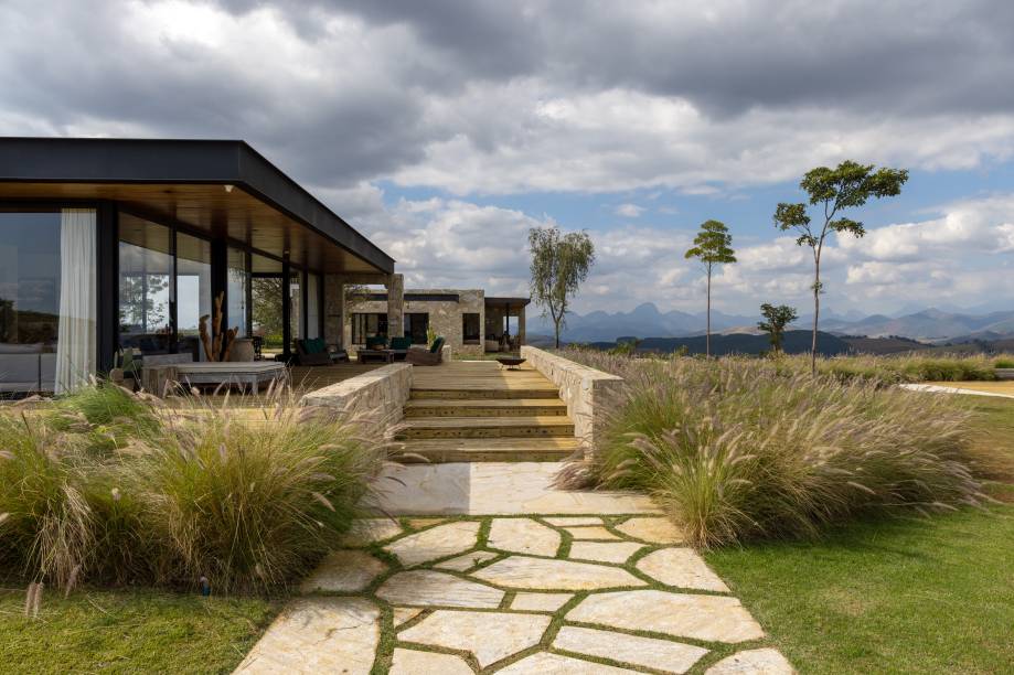 E o resultado desse trabalho refletiu a integração harmoniosa da casa com o entorno. “Conseguimos a conectividade entre os diferentes espaços através de caminhos e muretas de pedra natural, concebidos desde o princípio para se integrarem organicamente à paisagem”, completa Claudio Pedalino.