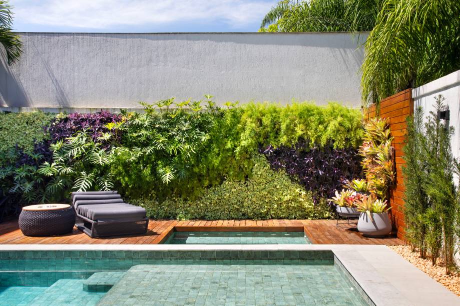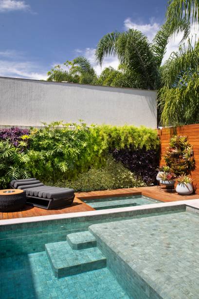 Paisagismo tropical: jardim tem bromélias, palmeiras e jardim vertical