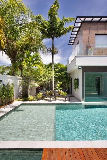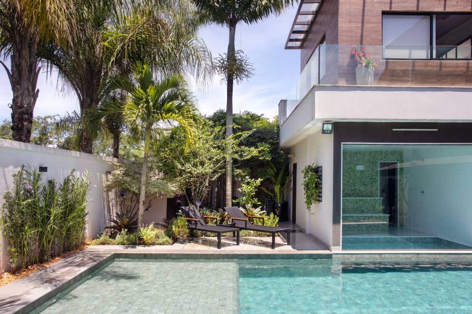 Como a área externa estava bem destruída e sem manutenção, com muita vegetação misturada e sem estilo, os moradores decidiram encomendar um projeto à arquiteta paisagista Maira Duarte, do Horto Girassol, que achou melhor eliminar o paisagismo anterior e reconstruir tudo do zero. Eles queriam “um paisagismo mais tropical, com vegetação variada e voltado para dentro da casa, que não chamasse a atenção do lado de fora, pois eles viajam bastante”, conta ela.
