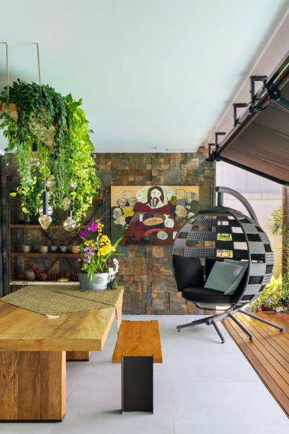 A lista de desejos dos proprietários não parou por aí. Eles também pediram uma horta, que o paisagismo fosse não só diverso, mas também denso, impactante e com pontos de cor, deixando a casa mais divertida. Por fim, solicitaram jardins verticais nos muros para trazer aconchego e um cantinho zen, com espécies aromáticas, criando um cenário perfeito para estimular a conexão da família com a natureza.