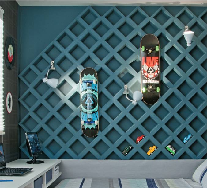 Em apenas 5m2, o dormitório moderno e masculino abriga área de estudo, espaço para hóspede e um cantinho diferenciado que exibe as coleções do rapaz.