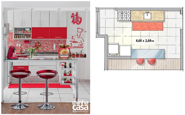 O vermelho salpica a decoração e tinge as pastilhas, as banquetas e as frentes de alguns módulos de armários desta cozinha