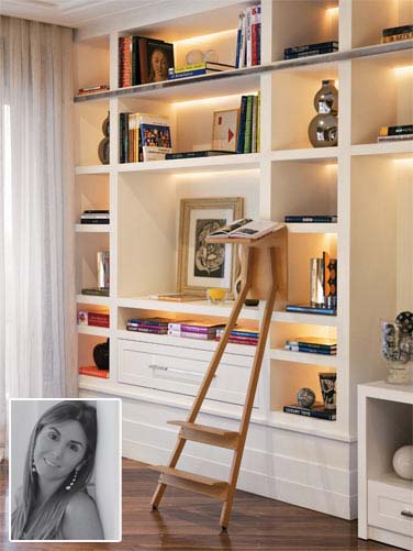 No apartamento de um casal que adora ler, os livros estão por toda parte. Escadas são um ótimo complemento para estantes altas, pois além de lindas, têm uma função, diz a arquiteta Christina Hamoui. E se você procura por estantes, não deixe de ver nossas sugestões. As miniescadas também podem exercer outra função enquanto não estão sendo usadas. Um opção é usá-la como apoio para casacos, bolsas e chapéus perto da porta de entrada.