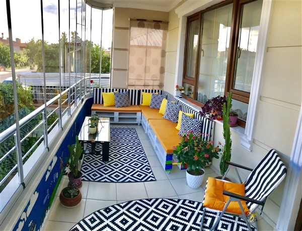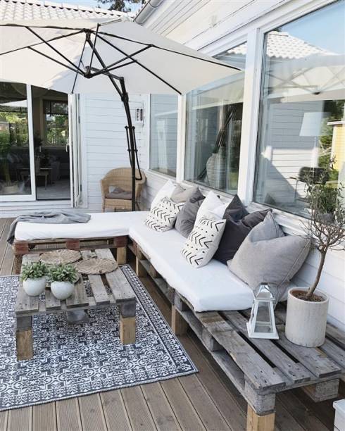 Além disso, o sofá de palete de varanda permitirá que você use cores diferentes como desejar. Além disso, são facilmente adaptáveis a outros acessórios, como materiais de iluminação de varandas, vasos de plantas e redes!