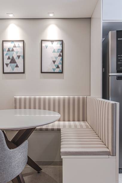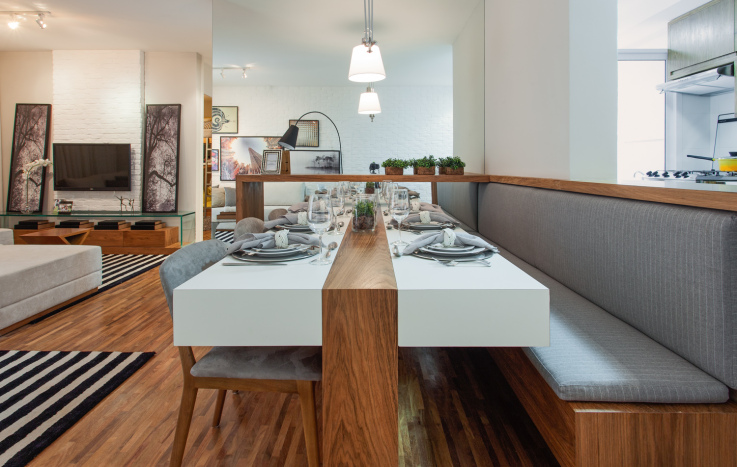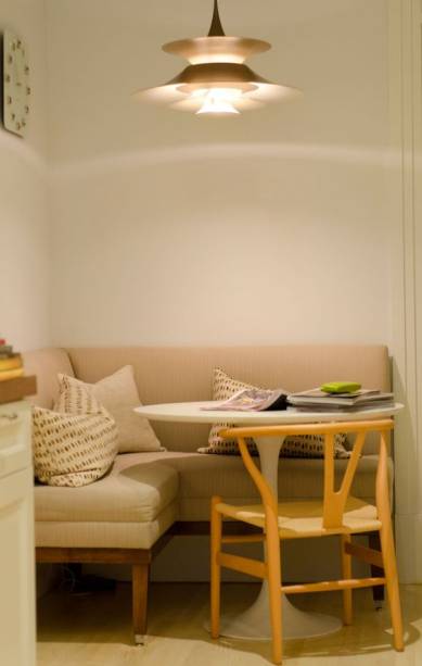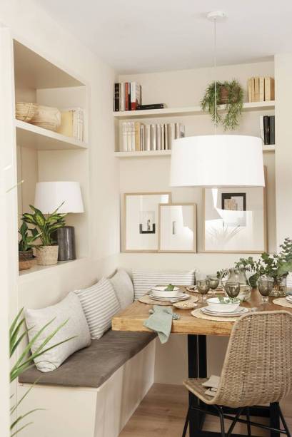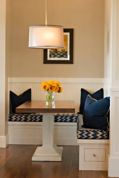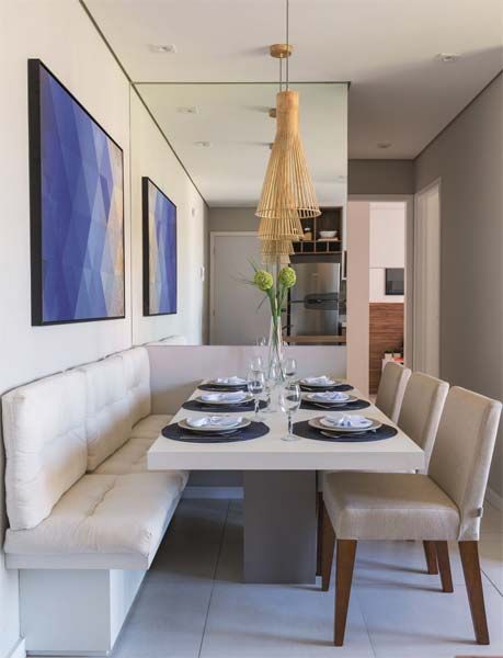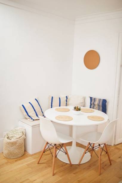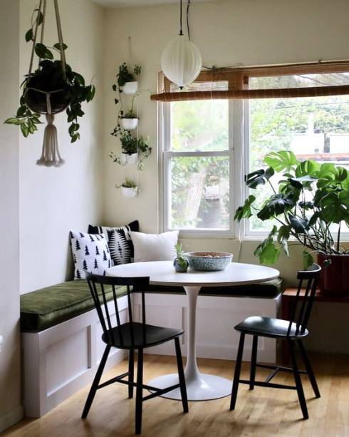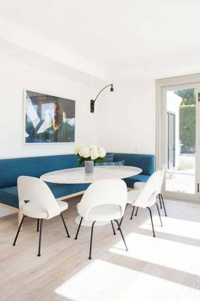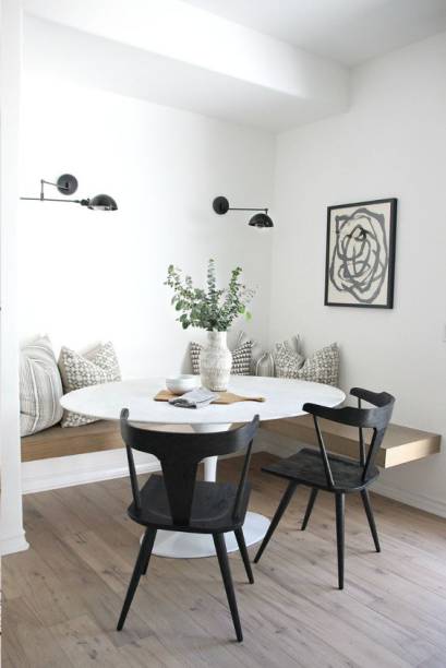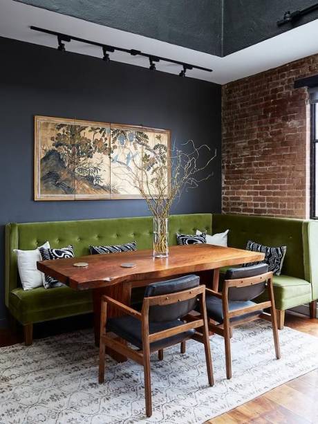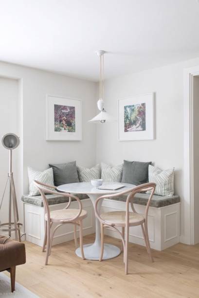 Uma opção muito utilizada para otimizar espaço, o canto alemão é um móvel de mesa de jantar que substitui as cadeiras por um banco que une dois lados perpendiculares (formando um ângulo reto, também conhecido como canto). Ele recebe esse nome, pois surgiu nos pubs da Alemanha.