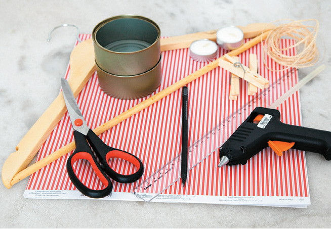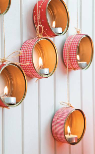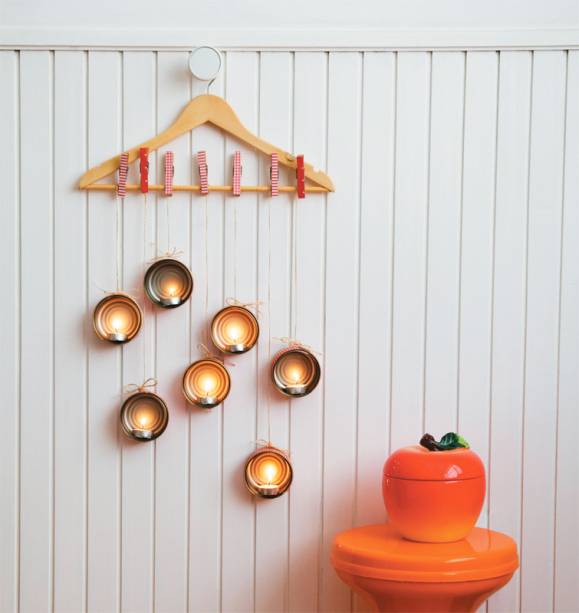 Quando vi em um blog estrangeiro esta peça, composta de latas de atum, velas para réchaud e um cabide, logo quis colocar a ideia em prática. Afinal, todo momento à luz da chama crepitante e quente fica íntimo e gostoso, não? Mas confesso que a primeira tentativa não deu certo. Segui as instruções de furar as embalagens, passando por dentro os fios de sisal – você pode imaginar o que aconteceu quando o fogo foi aceso! As cordinhas se romperam e a luminária se desfez. Para evitar acidentes, o segredo é envolver cada embalagem com o fio. Os demais passos são simples: acompanhe a sequência e crie sua versão.”