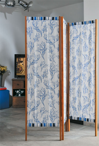 Versatilidade é a palavra para essa peça. O biombo pode definir um cantinho resguardado das visitas ou delimitar a circulação. Precisa de área livre? Dobre o acessório e o esconda atrás de um armário ou porta. O único inconveniente costuma ser o preço salgado. Na busca por uma solução econômica, o repórter visual Mario Mantovanni produziu o próprio biombo usando tecido e madeira. “As estampas com ar praiano darão um clima de verão o ano todo”, diz. Uma dica do moço é reaproveitar roupas de cama e cortinas antigas na confecção.