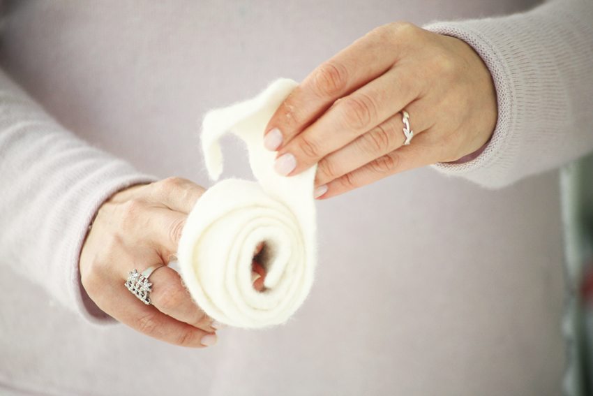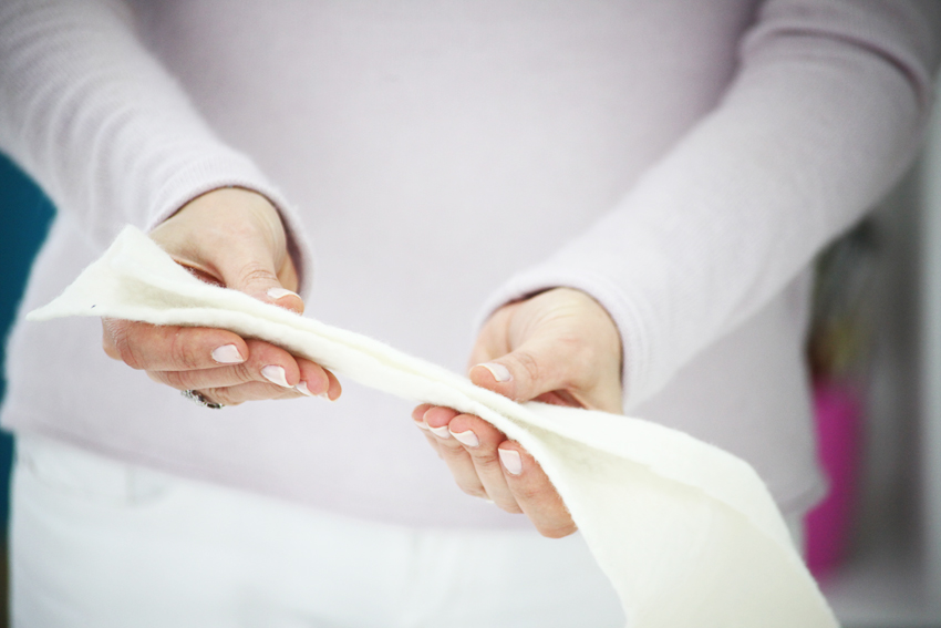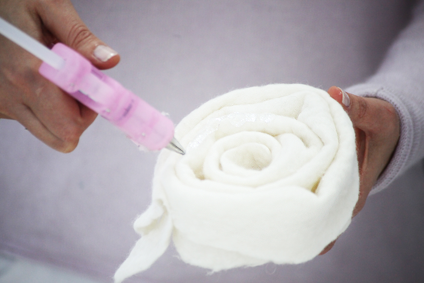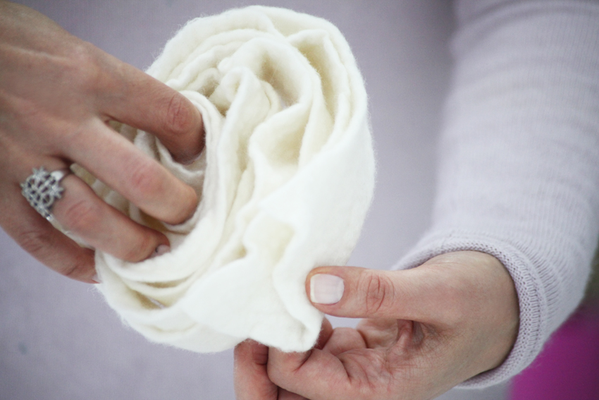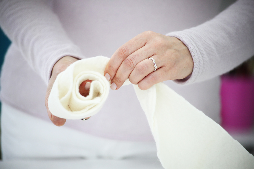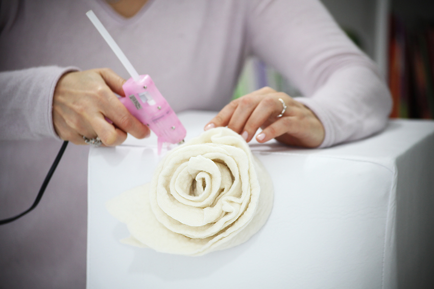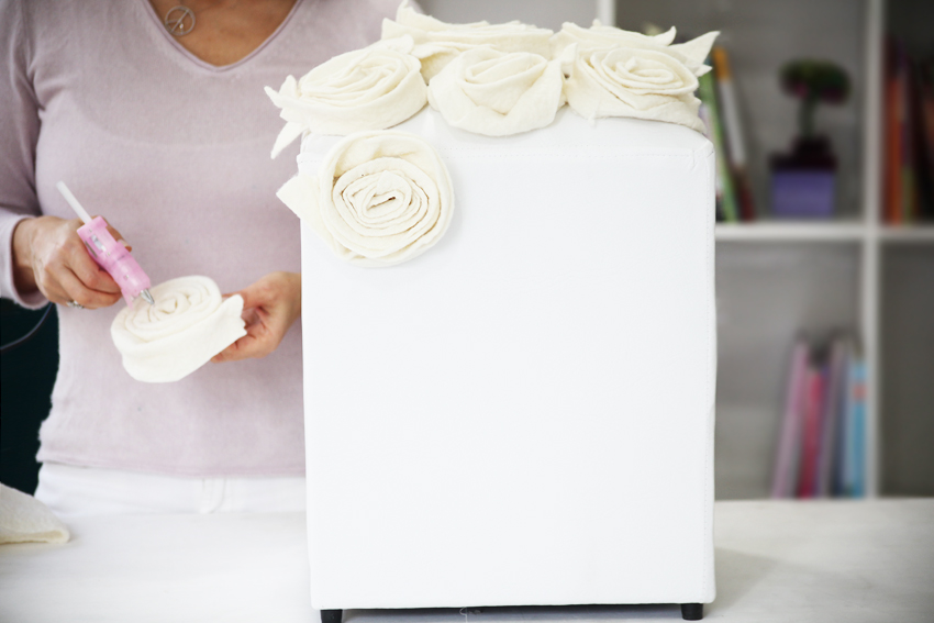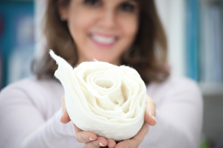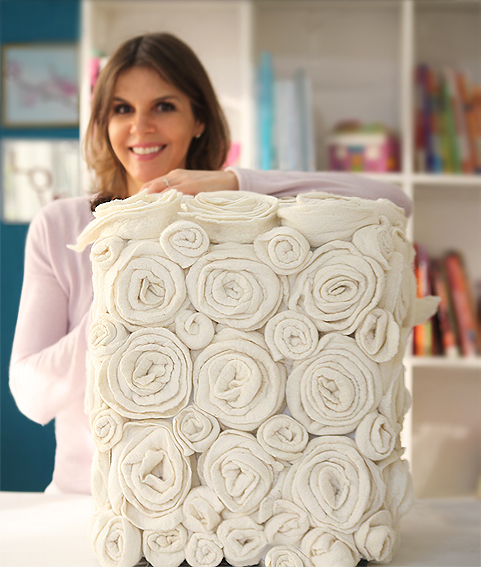 Denise Meneghello ensina como customizar um pufe com lindas flores de feltro