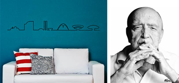 O traço leve e sinuoso do arquiteto carioca Oscar Niemeyer faz surgir construções que se tornam esculturas na paisagem. A inspiração, segundo ele, vem das curvas “livres e sensuais” admiradas nas montanhas brasileiras, no curso dos rios, no corpo da mulher amada… levar um toque dessa expressão artística para a decoração é a ideia do adesivo Homenagem Niemeyer (1,50 x 0,15 m, Stixx , r$ 88), que exibe a silhueta de projetos consagrados do mestre. da esquerda para a direita, enfileiram-se a Igreja da Pampulha (Belo Horizonte), o edifício Copan (São Paulo), o palácio do Congresso Nacional (Brasília), a praça da Apoteose (Rio de Janeiro), o museu de Arte Contemporânea (Niterói, RJ) e o Museu Oscar Niemeyer (Curitiba).