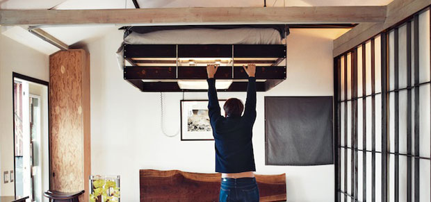 Americano suspende a cama durante o dia para ter mais espaço no apartamento.