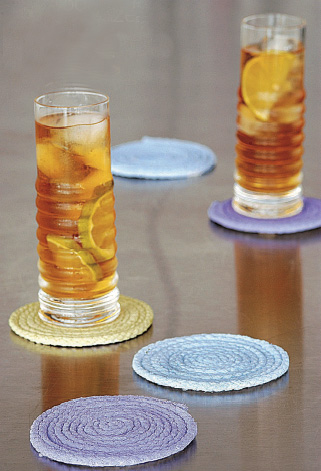 Alto verão, você serve aquela bebida refrescante para os amigos e inicia uma conversa gostosa. Não fica nada agradável ter de interromper o papo para buscar um pano e secar o vapor condensado que escorre por fora dos copos e ameaça manchar o tampo da mesa. Melhor ter um jogo de porta-copos à mão. Estas peças de barbante enrolado combinam com o clima informal da casa de praia e dos almoços à beira da piscina. Para criá-las, basta unir as várias voltas do cordão com cola e pintar.
