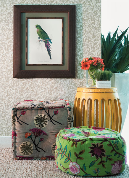 Ao combinar estampas florais, escolha uma cor que funcione como elo. Também fica bonito conciliar esse padrão com listras, usando diferentes tons da mesma cor, sugere o arquiteto Maurício Karam, de São Paulo.