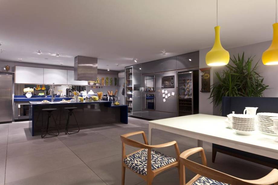 Marcenaria personalizada e cozinha azul são destaques em apê