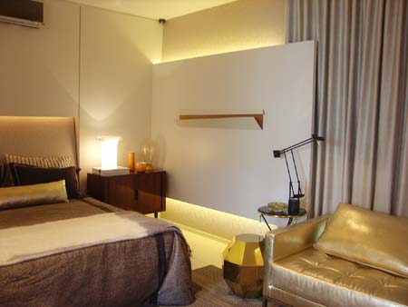 Toninho Noronha usou um plafond, de Ingo Mauer, de R$ 16 784 e uma mesa de latão de R$ 9 200 no Quarto do Casal