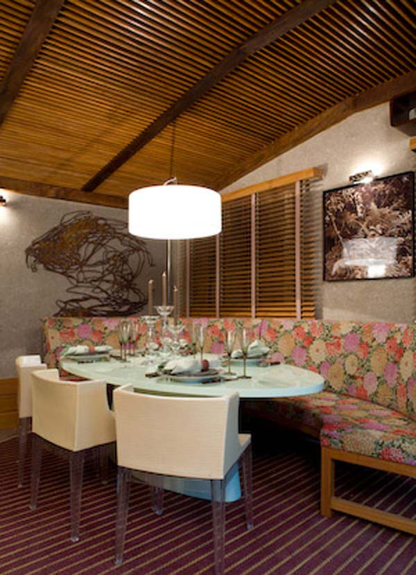A disposição do banco curvo revestido de linho estampado e das cadeiras de Philippe Starck facilita a circulação na área de 16 m2. O desnível no teto foi disfarçado com brises de madeira. A parede coberta de massa de papel machê lavável ajuda na limpeza.
