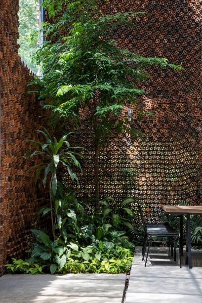 Composta por tijolos e vegetação, a construção tem paredes que permite a purificação do ar que entra