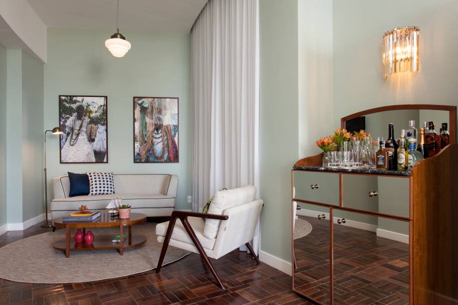 Na reforma, foi essencial garantir que o interior do hotel mesclasse o Art Déco com aspectos baianos. Logo, na recepção, o hóspede se depara com o piso em mosaico preto e branco, imponentes lustres e impressionantes esculturas da artista plástica baiana Nádia Taquary.