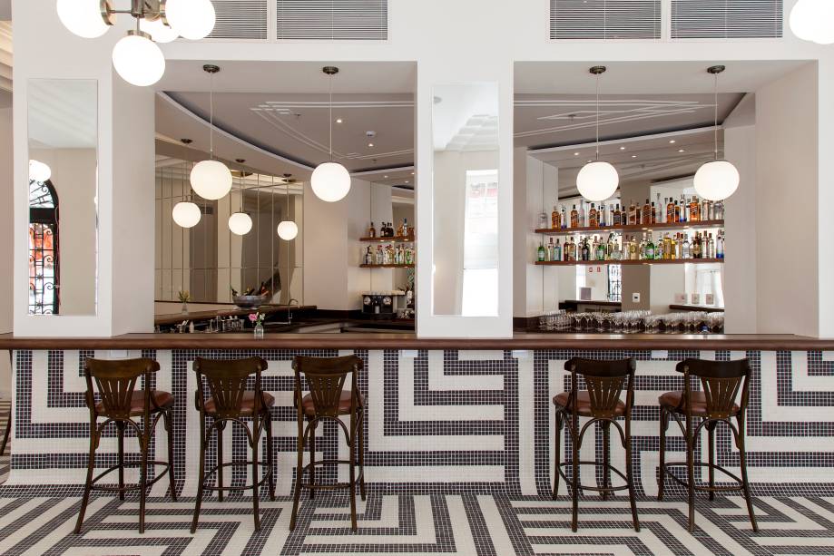 O balcão do lobby bar foi decorado com pastilhas estilo anos 30 e tampo em latão envelhecido e a adega de 4 metros de altura tem capacidade para mais de 1.000 rótulos variados.
